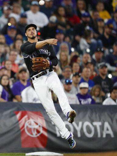 Colorado Rockies third baseman Nolan Arenado throws to first base to put out Toronto Blue Jays' Danny Jansen in the fifth inning of a baseball game Saturday, June 1, 2019, in Denver. (AP Photo/David Zalubowski) The Associated Press