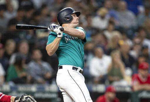 Seattle Mariners' Jay Bruce hits a solo home run off of Los Angeles Angels starting pitcher Tyler Skaggs during the seventh inning of a baseball game Friday, May 31, 2019, in Seattle. The home run was the 300th of Bruce'S career. (AP Photo/Stephen Brashear) The Associated Press