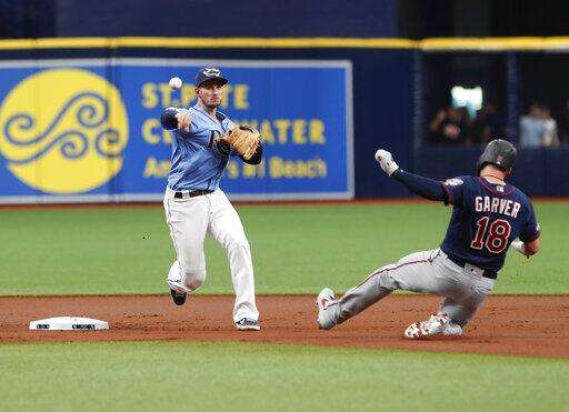 Tampa Bay Rays second baseman Daniel Robertson throws to first base after forcing out Minnesota Twins Mitch Garner during the first inning of a baseball game Sunday, June 2, 2019, in St. Petersburg, Fla. (AP Photo/Scott Audette) The Associated Press