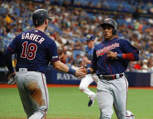 Minnesota Twins' Jorge Polanco, right, and teammate Mitch Garver celebrate after scoring against the Tampa Bay Rays during the fifth inning of a baseball game Sunday, June 2, 2019, in St. Petersburg, Fla. (AP Photo/Scott Audette) The Associated Press