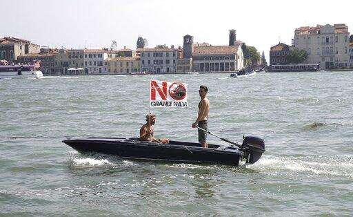 A man on a boat holds a flag reading in Italian No Big Ships, during a protest against cruise ships being allowed in the lagoon, in Venice, Italy, Saturday, June 8, 2019. Venice environmentalists have long complained that cruise ships displace water, wear down fragile foundations, cause air pollution and damage the delicate lagoon environment by dredging up the muddy bottom. (AP Photo/Luca Bruno)