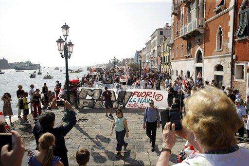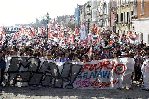 The protest Saturday was galvanized by a crash six days earlier involving a cruise ship that struck a much smaller river boat in Venice's Giudecca Canal. The crash injured five people.