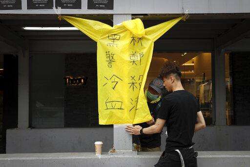 Mourners meanwhile laid flowers Sunday on the pavement near where a man fell to his death a day earlier after hanging a protest banner on scaffolding on a shopping mall.