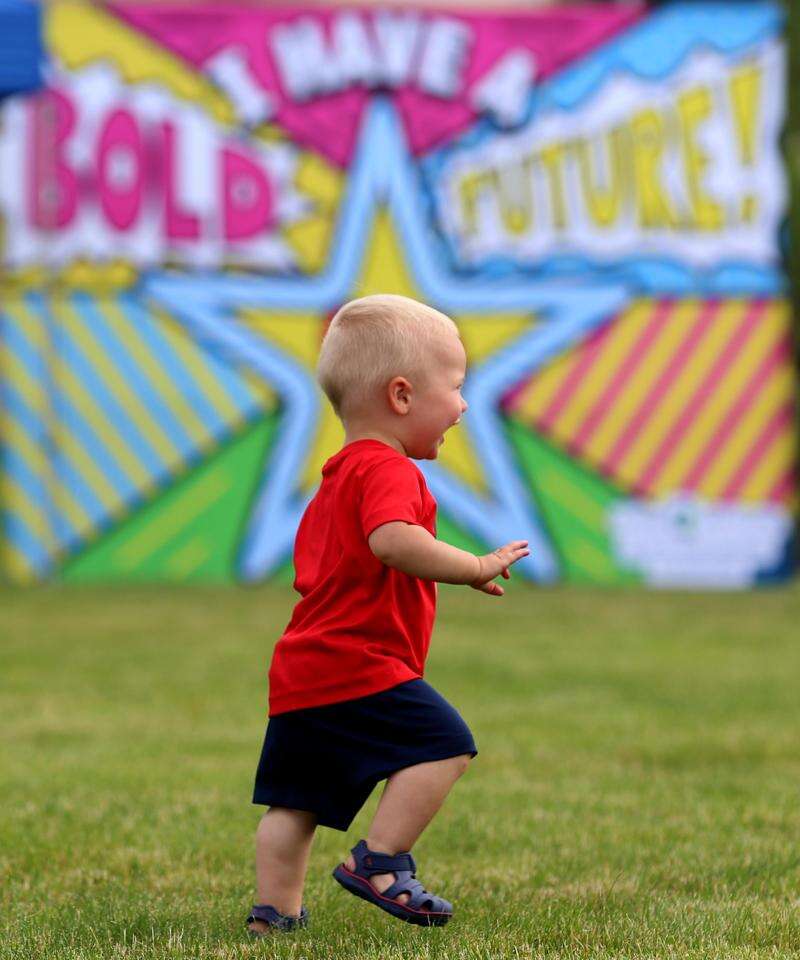 Fifteen-month-old Eli Wiedrich of Lindenhurst strolls with his family past the College of Lake County booth as BeachFest kicked off Friday at the Round Lake Beach Cultural & Civic Center.