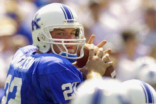FILE - In this Sept. 7, 2002, file photo, Kentucky quarterback Jared Lorenzen looks downfield for a receiver during the first half of the team's NCAA college football game against UTEP in Lexington, Ky. Lorenzen, a husky left-handed quarterback who set multiple Kentucky passing and offensive records before backing up Eli Manning on the New York Giants’ Super Bowl-winning 2007 team, has died. He was 38. A release from the school said Lorenzen’s family announced his death on Wednesday. (AP Photo/Ed Reinke, File) The Associated Press