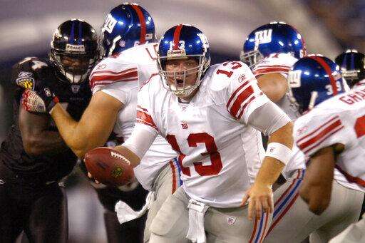 FILE - In this Aug. 19, 2007, file photo, New York Giants quarterback Jared Lorenzen (13) hands off to running back Ryan Grant (39) during the team's preseason NFL football game against the Baltimore Ravens in Baltimore. Lorenzen, a husky left-handed quarterback who set multiple Kentucky passing and offensive records before backing up Eli Manning on the Giants’ Super Bowl-winning 2007 team, has died. He was 38. A release from the school said Lorenzen’s family announced his death on Wednesday, July 3. (AP Photo/Gail Burton, File) The Associated Press