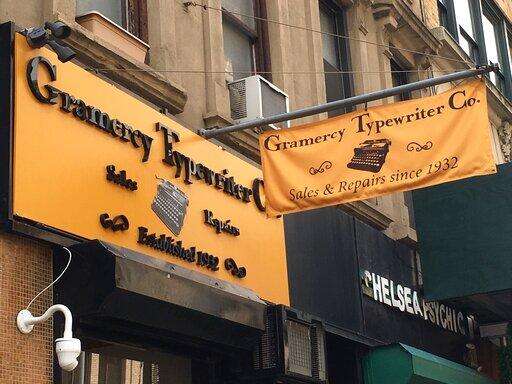 This June 28, 2019 photo shows the exterior of Gramercy Typewriter Co. in New York, which sells vintage typewriters, all in working condition. Vintage typewriters are sent for repair and restoration daily from around the country, the owner says. (Katherine Roth via AP) The Associated Press