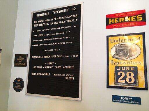 This June 28, 2019 photo shows signs on the wall of the Gramercy Typewriter Co. in New York, which sells working vintage typewriters and ribbons for them, and repairs vintage typewriters. Vintage typewriters are sent for repair and restoration daily from around the country, the owner says. (Katherine Roth via AP) The Associated Press