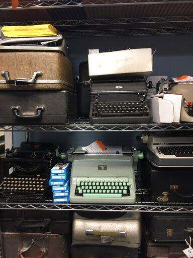 This June 28, 2019 photo shows a shelf of vintage typewriters in the repair shop of the Gramercy Typewriter Co., in New York. Vintage typewriters are sent for repair and restoration daily from around the country, the stores owner says. (Katherine Roth via AP) The Associated Press