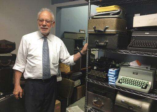 This June 28, 2019 photo shows Paul Schweitzer standing in the Gramercy Typewriter Co. repair shop in New York, alongside a shelf of vintage typewriters. Schweitzer who, with his son, owns the Gramercy Typewriter Co, founded by Schweitzer's father in 1932. Vintage typewriters are sent for repair and restoration daily from around the country, Schweitzer says. (Katherine Roth via AP) The Associated Press