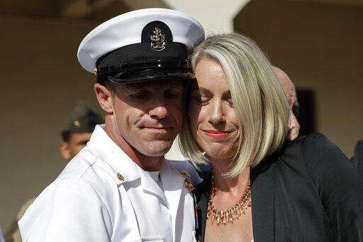 Navy Special Operations Chief Edward Gallagher, left, walks with his wife, Andrea Gallagher as they arrive to military court on Naval Base San Diego, Monday, July 1, 2019, in San Diego. The trial continued Monday in the court-martial of the decorated Navy SEAL, who is accused of stabbing to death a wounded teenage Islamic State prisoner and wounding two civilians in Iraq in 2017. He has pleaded not guilty to murder and attempted murder, charges that carry a potential life sentence. (AP Photo/Julie Watson)