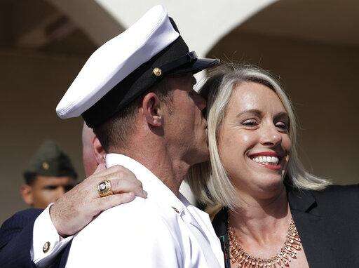 Navy Special Operations Chief Edward Gallagher, left, kisses his wife, Andrea Gallagher after leaving a military court on Naval Base San Diego, Tuesday, July 2, 2019, in San Diego. A military jury acquitted the decorated Navy SEAL Tuesday of murder in the killing of a wounded Islamic State captive under his care in Iraq in 2017. (AP Photo/Gregory Bull)