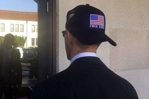 Marc Mukasey, defense lawyer for Navy Special Operations Chief Edward Gallagher, shows off a hat with the words, "free Eddie," as he arrives to military court on Naval Base San Diego, Tuesday, July 2, 2019, in San Diego. Jury deliberations continued Tuesday morning in the court-martial of the decorated Navy SEAL, who is accused of stabbing to death a wounded teenage Islamic State prisoner and wounding two civilians in Iraq in 2017. He has pleaded not guilty to murder and attempted murder, charges that carry a potential life sentence. (AP Photo/Julie Watson)