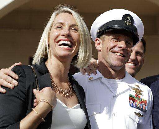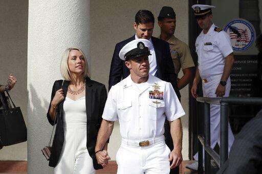 Navy Special Operations Chief Edward Gallagher, center, walks with his wife, Andrea Gallagher, as they leave a military court on Naval Base San Diego, Tuesday, July 2, 2019, in San Diego. A military jury acquitted the decorated Navy SEAL Tuesday of murder in the killing of a wounded Islamic State captive under his care in Iraq in 2017. (AP Photo/Gregory Bull)