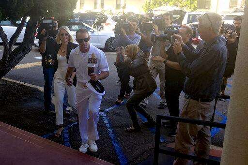 Navy Special Operations Chief Edward Gallagher, left, walks with his wife, Andrea Gallagher as they arrive to military court on Naval Base San Diego, Monday, July 1, 2019, in San Diego. The trial continued Monday in the court-martial of the decorated Navy SEAL, who is accused of stabbing to death a wounded teenage Islamic State prisoner and wounding two civilians in Iraq in 2017. He has pleaded not guilty to murder and attempted murder, charges that carry a potential life sentence. (AP Photo/Julie Watson)