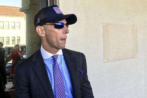 Marc Mukasey, defense lawyer for Navy Special Operations Chief Edward Gallagher, shows off a hat with the words, "free Eddie," as he arrives to military court on Naval Base San Diego, Tuesday, July 2, 2019, in San Diego. Jury deliberations continued Tuesday morning in the court-martial of the decorated Navy SEAL, who is accused of stabbing to death a wounded teenage Islamic State prisoner and wounding two civilians in Iraq in 2017. He has pleaded not guilty to murder and attempted murder, charges that carry a potential life sentence. (AP Photo/Julie Watson)