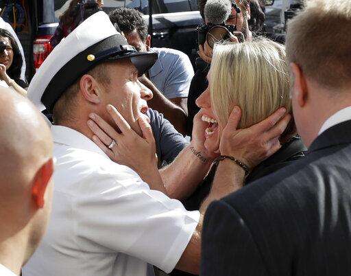 Navy Special Operations Chief Edward Gallagher, left, kisses his wife, Andrea Gallagher after leaving a military court on Naval Base San Diego, Tuesday, July 2, 2019, in San Diego. A military jury acquitted the decorated Navy SEAL Tuesday of murder in the killing of a wounded Islamic State captive under his care in Iraq in 2017. (AP Photo/Gregory Bull)