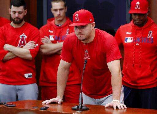 ARLINGTON, Texas (AP) - Mike Trout led a parade of Los Angeles Angels into the interview room of the Texas Rangers for the first interaction with reporters since teammate Tyler Skaggs died.