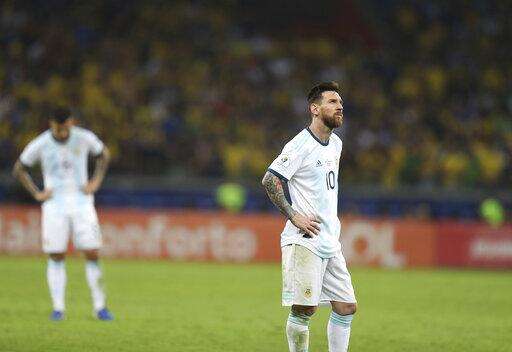 Argentina's Lionel Messi reacts during a Copa America semifinal soccer match at the Mineirao stadium in Belo Horizonte, Brazil, Tuesday, July 2, 2019. (AP Photo/Natacha Pisarenko) The Associated Press