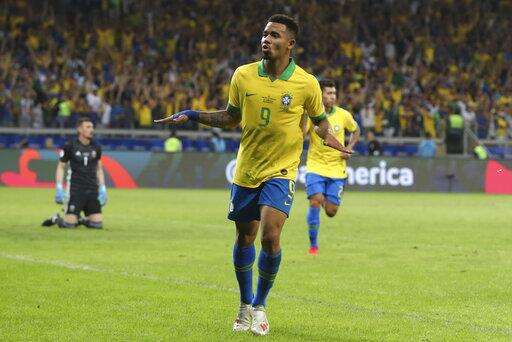 Brazil's Gabriel Jesus celebrates his side's 2nd goal scored by teammate Roberto Firmino, back, during a Copa America semifinal soccer match against Argentina at the Mineirao stadium in Belo Horizonte, Brazil, Tuesday, July 2, 2019. (AP Photo/Ricardo Mazalan) The Associated Press