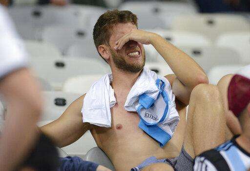An Argentina fan cries in the stands after his team lost 2-0 to Brazil in a Copa America semifinal soccer match at Mineirao stadium in Belo Horizonte, Brazil, Tuesday, July 2, 2019. (AP Photo/Eugenio Savio) The Associated Press