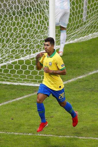 Brazil's Roberto Firmino, center, celebrates scoring his side's 2nd goal against Argentina during a Copa America semifinal soccer match at the Mineirao stadium in Belo Horizonte, Brazil, Tuesday, July 2, 2019. (AP Photo/Nelson Antoine) The Associated Press