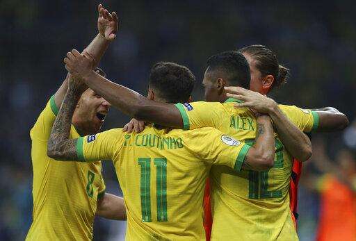 Brazilian players celebrate at the end of a Copa America semifinal soccer match against Argentina at the Mineirao stadium in Belo Horizonte, Brazil, Tuesday, July 2, 2019. Brazil won 2-0 and and advanced to the final. (AP Photo/Ricardo Mazalan) The Associated Press
