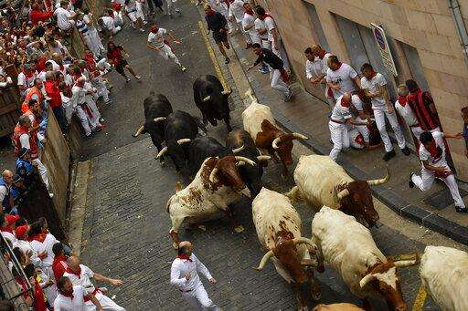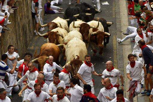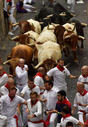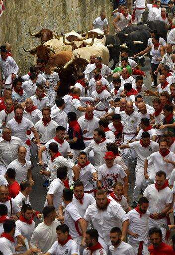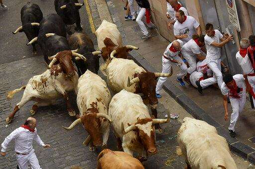 Revellers run next to fighting bulls during the running of the bulls at the San Fermin Festival, in Pamplona, northern Spain, Sunday, July 7, 2019. Revellers from around the world flock to Pamplona every year to take part in the eight days of the running of the bulls. (AP Photo/Alvaro Barrientos)