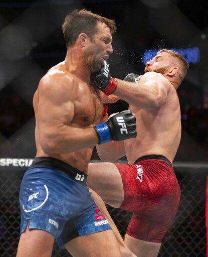 Jan Blachowicz, left, trades punches with Luke Rockhold during their light heavyweight mixed martial arts bout at UFC 239, Saturday, July 6, 2019, in Las Vegas. Blachowicz won by knockout. (AP Photo/Eric Jamison) The Associated Press
