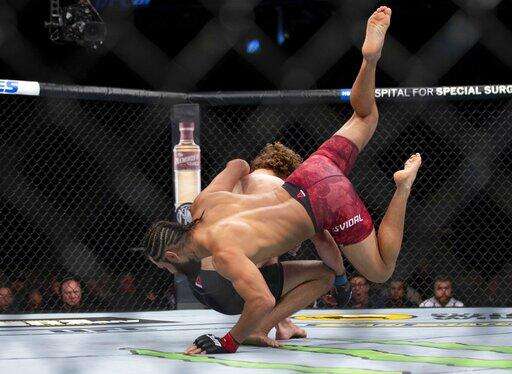 Jorge Masvidal, lands a flying knee on Ben Askren at the start of their welterweight mixed martial arts bout at UFC 239, Saturday, July 6, 2019, in Las Vegas. Masvidal won by the fastest knockout in UFC history. (AP Photo/Eric Jamison) The Associated Press
