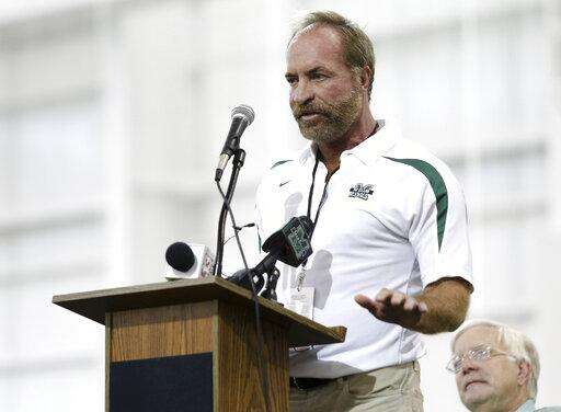 In this Sept. 6, 2014 photo, Chris Cline speaks as Marshall University dedicates the new indoor practice facility as the Chris Cline Athletic Complex in Huntington, W.Va. Police in the Bahamas say a helicopter flying from Big Grand Cay island to Fort Lauderdale has crashed, killing seven Americans on board. None of the bodies recovered from the downed helicopter have been identified, but police Supt. Shanta Knowles told The Associated Press on Friday, July 5, 2019, that the missing-aircraft report from Florida said billionaire Chris Cline was on board. (Sholten Singer/The Herald-Dispatch via AP) The Associated Press