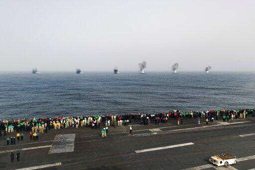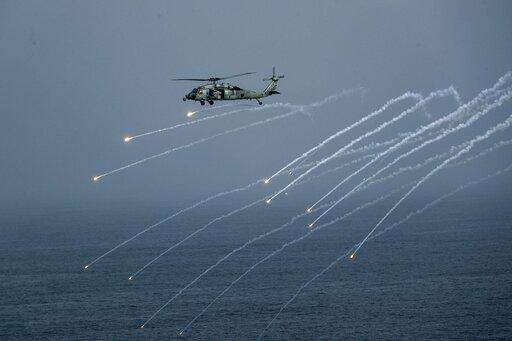 In this Thursday, July 4, 2019, photo made available by U.S. Navy, Sea Hawk helicopter assigned to the "Nightdippers" of Helicopter Sea Combat Squadron (HSC) 5 releases flares during an Independence Day air power demonstration next to the Nimitz-class aircraft carrier USS Abraham Lincoln in Arabian Sea. The USS Abraham Lincoln was rushed to the Mideast amid tensions between the U.S. and Iran as its 2015 nuclear deal with world powers unravels. (Mass Communication Specialist 3rd Class Jeff Sherman/U.S. Navy via AP) The Associated Press