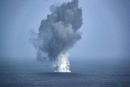 In this Thursday, July 4, 2019, photo made available by U.S. Navy, two F/A-18 Super Hornets assigned to Carrier Air Wing (CVW 7) drop 1000-pound general-purpose bombs during an Independence Day air power demonstration next to the Nimitz-class aircraft carrier USS Abraham Lincoln in Arabian Sea. The USS Abraham Lincoln was rushed to the Mideast amid tensions between the U.S. and Iran as its 2015 nuclear deal with world powers unravels. (Mass Communication Specialist 3rd Class Jeff Sherman/U.S. Navy via AP) The Associated Press