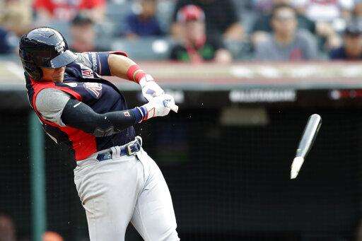 Miguel Amaya, of the Chicago Cubs, breaks his bat during the third inning of the MLB All-Star Futures baseball game, Sunday, July 7, 2019, in Cleveland. The 90th MLB baseball All-Star Game will be played Tuesday. (AP Photo/Tony Dejak) The Associated Press