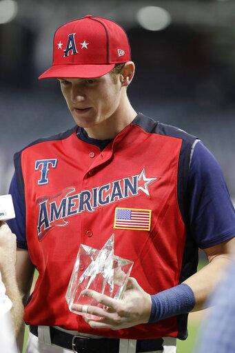 Sam Huff, of the Texas Rangers, holds the MVP trophy following the MLB All-Star Futures baseball game, Sunday, July 7, 2019, in Cleveland. The 90th MLB baseball All-Star Game will be played Tuesday. (AP Photo/Darron Cummings) The Associated Press