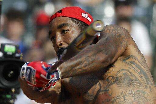 J.R. Smith hits during the All-Star MLB Celebrity Softball game, Sunday, July 7, 2019, in Cleveland. The 90th MLB baseball All-Star Game will be played Tuesday. (AP Photo/Darron Cummings) The Associated Press