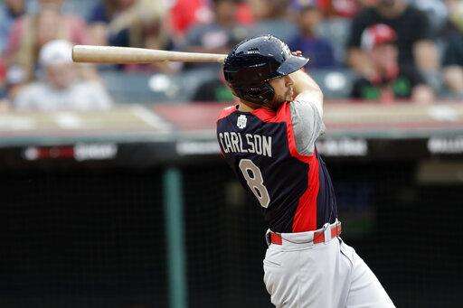 Dylan Carlson, of the St. Louis Cardinals, hits an RBI-single during the fourth inning of the MLB All-Star Futures baseball Game, Sunday, July 7, 2019, in Cleveland. The MLB baseball All-Star Game is to be played Tuesday. (AP Photo/Tony Dejak) The Associated Press