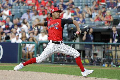 Deivi Garcia, of the New York Yankees, throws during the first inning of the MLB All-Star Futures baseball game, Sunday, July 7, 2019, in Cleveland. The MLB baseball All-Star Game is to be played Tuesday. (AP Photo/Darron Cummings) The Associated Press