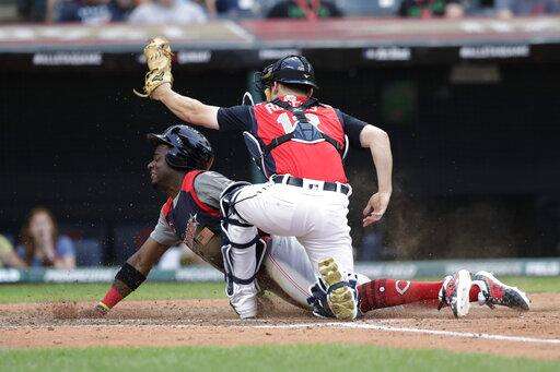 Taylor Trammell, of Cincinnati Reds, is tagged out by Jake Rogers, of the Detroit Tigers, during the fourth inning of the MLB All-Star Futures baseball game, Sunday, July 7, 2019, in Cleveland. The 90th MLB baseball All-Star Game will be played Tuesday. (AP Photo/Tony Dejak) The Associated Press