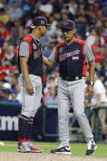 National League manager Dennis Martinez talks with Luis Patino, of the San Diego Padres, during the eighth inning of the MLB All-Star Futures baseball game, Sunday, July 7, 2019, in Cleveland. The 90th MLB baseball All-Star Game will be played Tuesday. (AP Photo/Darron Cummings) The Associated Press
