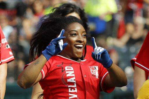 Simone Biles reacts after scoring during the All-Star MLB Celebrity Softball Game, Sunday, July 7, 2019, in Cleveland. The MLB baseball All-Star Game is to be played Tuesday. (AP Photo/Darron Cummings) The Associated Press