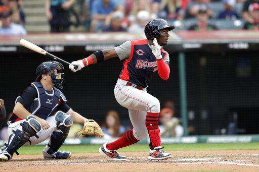 Taylor Trammell, of Cincinnati Reds, hits an RBI single during the fourth inning of the MLB All-Star Futures baseball game, Sunday, July 7, 2019, in Cleveland. The 90th MLB baseball All-Star Game will be played Tuesday. (AP Photo/Tony Dejak) The Associated Press