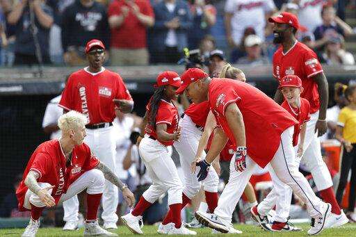 Carlos Baerga, right, celebrates after hitting a home run during the All Star MLB Celebrity Softball Game, Sunday, July 7, 2019, in Cleveland. The 90th MLB baseball All-Star Game will be played Tuesday. (AP Photo/Tony Dejak) The Associated Press