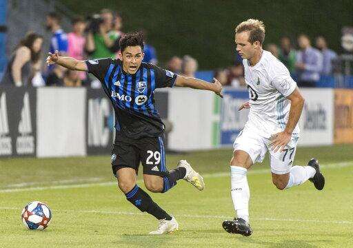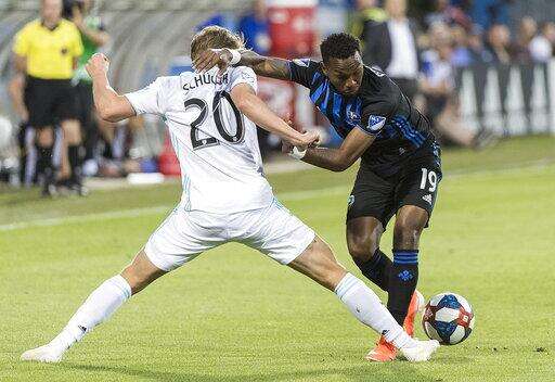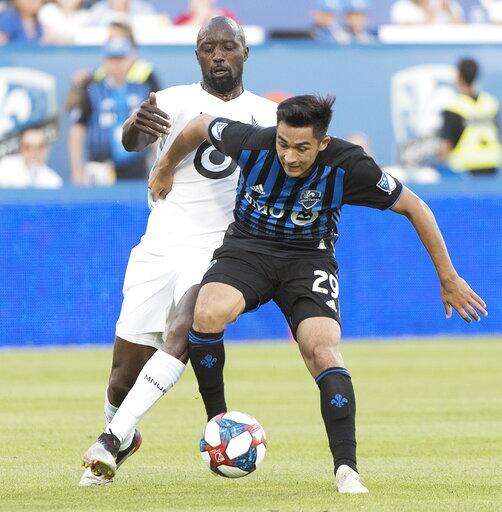 Montreal Impact's Mathieu Choiniere, right, challenges Minnesota United's Lawrence Olum during first half of an MLS soccer match in Montreal, Saturday, July 6, 2019. (Graham Hughes/The Canadian Press via AP)
