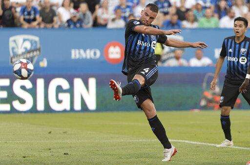 Montreal Impact's Rudy Camacho scores against Minnesota United during first half of an MLS soccer match in Montreal, Saturday, July 6, 2019. (Graham Hughes/The Canadian Press via AP)