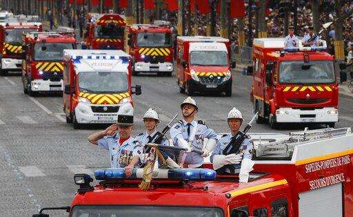 Firefighters drive on the Champs-Elysees avenue during the Bastille Day parade in Paris, France, Sunday July 14, 2019. (AP Photo/Michel Euler)
