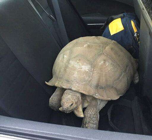 This Sunday, July 14, 2019, photo provided by the California Highway Patrol shows a 250-pound tortoise in a patrol car that officers rescued after it wandered away from its home and was spotted on the shoulder of a road in Santa Ynez, Calif., about 100 miles (161 kilometers) northwest of Los Angeles. The CHP says it got a call about the big reptile Sunday evening, located the owners, put the tortoise in the patrol car and delivered it to them about two hours later. (California Highway Patrol via AP)