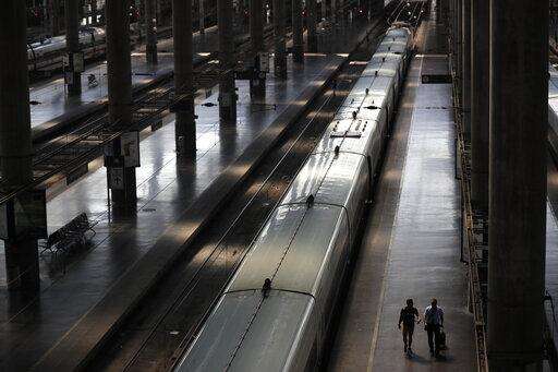 Passengers walk among trains parked during rail strike at the Atocha station in Madrid, Spain, Wednesday, July 31, 2019. Spanish national rail operator Renfe has canceled hundreds of train journeys on one of the busiest travel days of the year due to a strike over staffing levels. The company said more than 700 scheduled services wouldn't operate Wednesday, a day when many people would normally head off for their summer vacation.(AP Photo/Manu Fernandez) The Associated Press