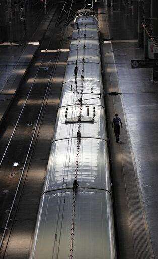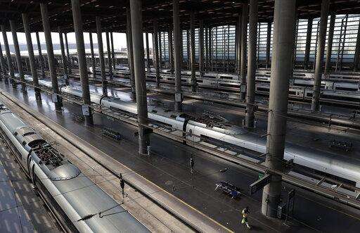 A worker walks among trains parked at the Atocha station during a rail strike in Madrid, Spain, Wednesday, July 31, 2019. Spanish national rail operator Renfe has canceled hundreds of train journeys on one of the busiest travel days of the year due to a strike over staffing levels. The company said more than 700 scheduled services wouldn't operate Wednesday, a day when many people would normally head off on their summer vacation. (AP Photo/Manu Fernandez) The Associated Press