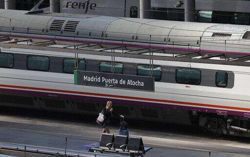 A passenger walks among trains parked during rail strike at the Atocha station in Madrid, Spain, Wednesday, July 31, 2019. Spanish national rail operator Renfe has canceled hundreds of train journeys on one of the busiest travel days of the year due to a strike over staffing levels. The company said more than 700 scheduled services wouldn't operate Wednesday, a day when many people would normally head off for their summer vacation. (AP Photo/Manu Fernandez) The Associated Press